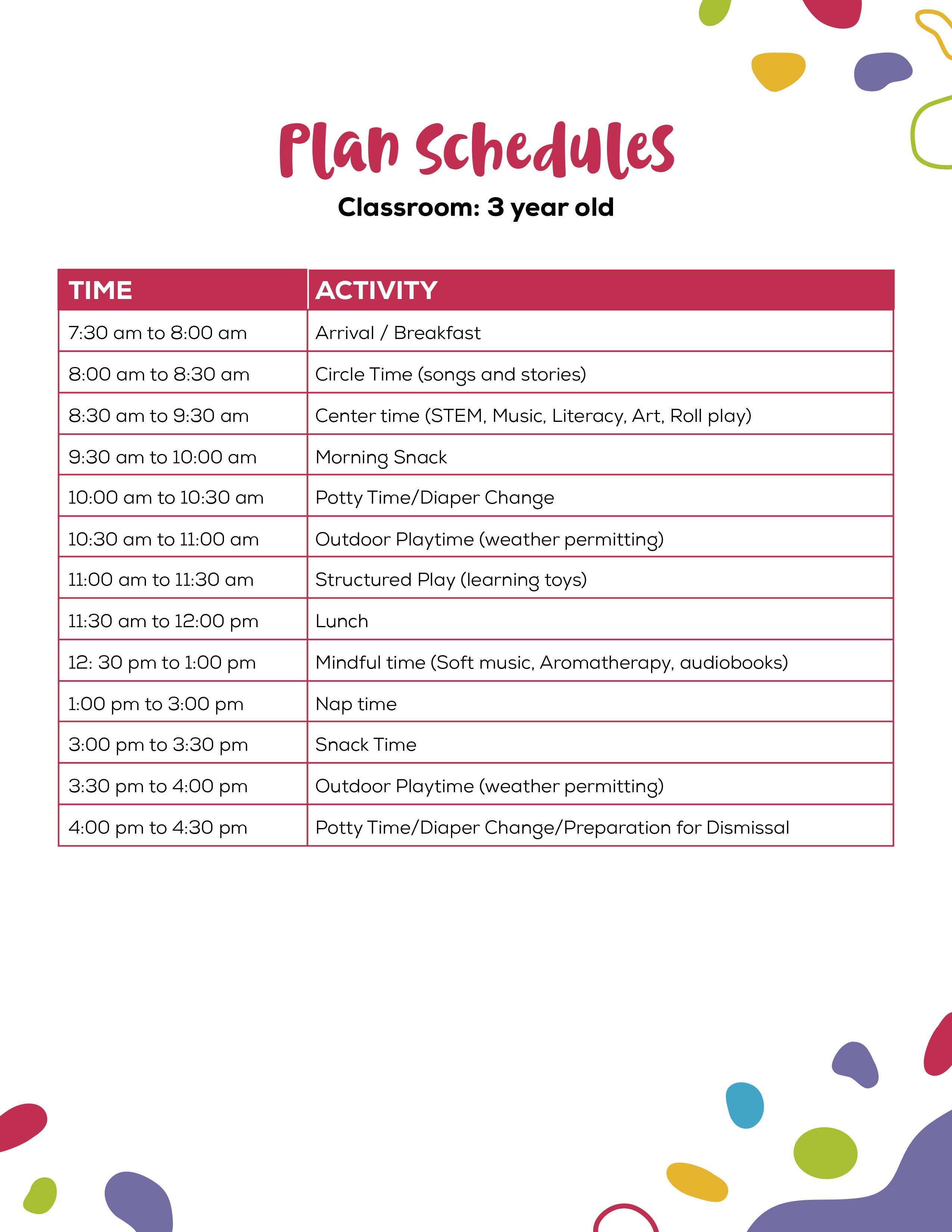 - Free play: Children have time to explore their interests, play with peers, and engage in imaginative play.