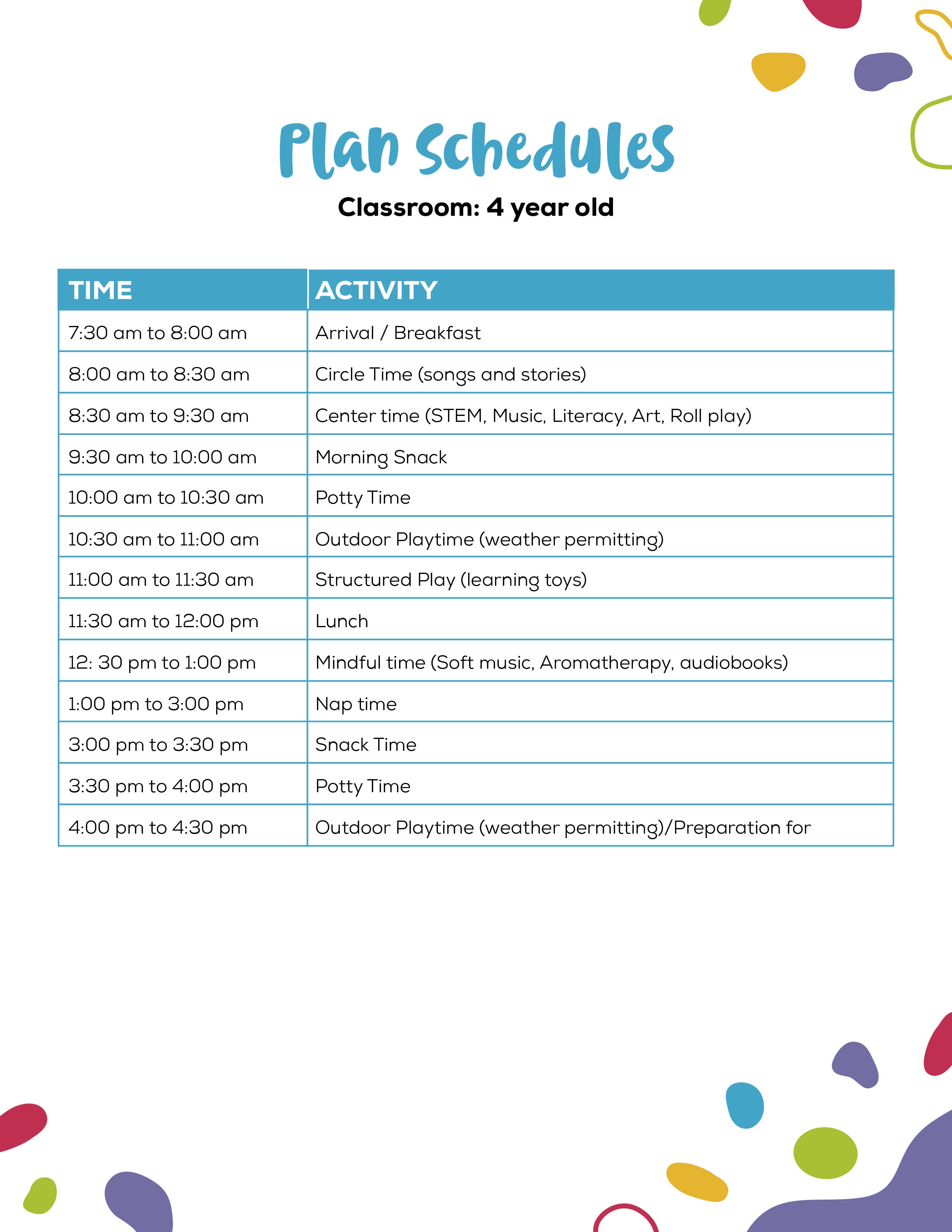 - Free play: Children have time to explore their interests, play with peers, and engage in imaginative play.